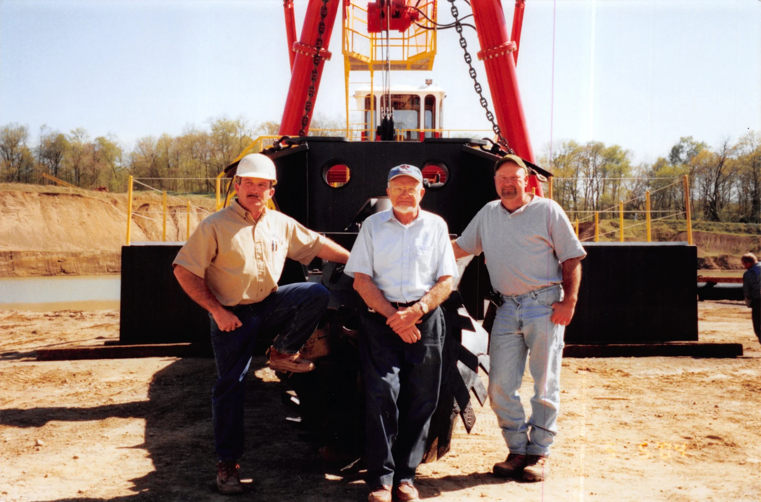 Our two current owners, Steve Schlabach (Left) and Phil Schlabach (Right) with their father and founder of Melway Paving, Andy Schlabach. At the launch of Holmes Supply’s new dredge in 2004.